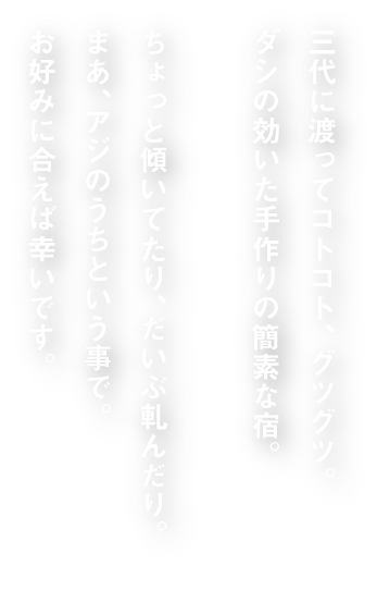 B&Bスタイルの素泊まりで7部屋17名定員のこじんまりとしたサイズ。武骨ですが優しい温かさが宿売る。足掛け3代、築60数年の木造の古民家です。軋む床と防音が不十分な壁のために上下左右に音が響き渡ります。思いやりの気持ちで館内では静かにお過ごしになられる事をお願い申し上げます。